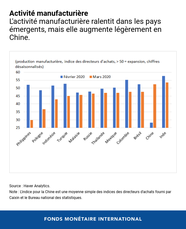 Les perturbations causées par le virus commencent à se faire sentir dans les pays émergents. Après n’avoir guère varié au début de l’année, les derniers indices reposant sur des enquêtes menées auprès des directeurs d’achats font état d'un ralentissement marqué de la production manufacturière dans beaucoup de pays, du fait de la baisse de la demande extérieure et des attentes croissantes d’une diminution de la demande intérieure. Sur une note positive, la Chine affiche une amélioration modeste de son indice des directeurs d'achat après de fortes baisses au début de l’année, en dépit d’une faible demande extérieure.