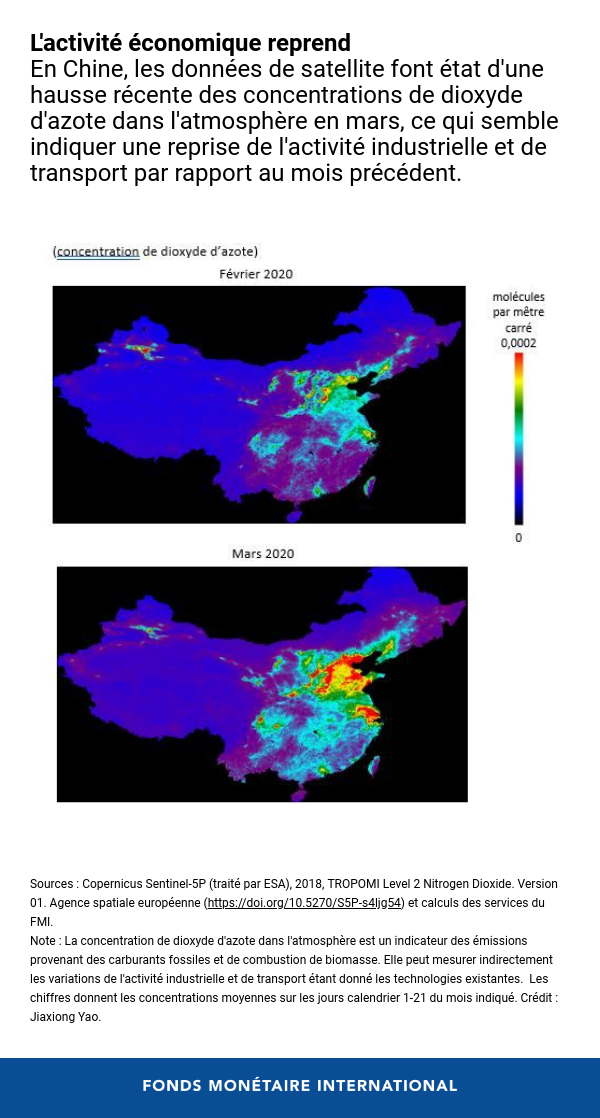 La légère amélioration de l’activité économique en Chine apparaît aussi dans les données de satellite journalières relatives aux concentrations de dioxyde d’azote dans l’atmosphère locale, un indicateur de l’activité industrielle et de transport (mais aussi de la densité de la pollution comme sous-produit de la consommation de carburants fossiles). Après une forte diminution de janvier à février pendant la phase aigüe de la pandémie, les concentrations ont augmenté du fait de la baisse des nouvelles infections, ce qui a permis à la Chine d'assouplir progressivement ses mesures de confinement strictes.