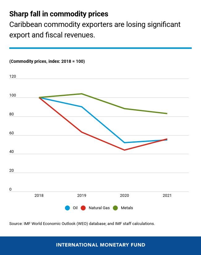 La chute des prix des produits de base provoque dans les pays exportateurs, comme le Guyana, le Suriname et Trinité-et-Tobago, une perte des revenus correspondants et de recettes fiscales. En outre, les entreprises du secteur de l’énergie pourraient réviser en baisse leurs plans de production, en prévision d’un affaiblissement de la demande d’énergie dû au recul général de l’activité manufacturière. Dans les pays importateurs de pétrole, la diminution de son prix amortira le choc.