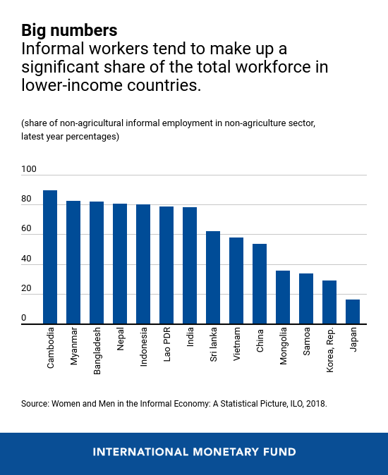 Dans la région Asie-Pacifique, l’économie informelle représente près de 60 % des emplois non agricoles, une proportion plus forte qu’en Amérique latine et en Europe de l’Est. Le taux varie entre environ 20 % au Japon et plus de 80 % au Myanmar et au Cambodge. Le statut, les revenus et le secteur d’activité de tous ces travailleurs varient grandement : travailleurs sans aucune protection sociale ni autre assurance officielle dans l’économie formelle ou informelle, travailleurs autonomes (vendeurs ambulants et membres de leur famille) et journaliers.