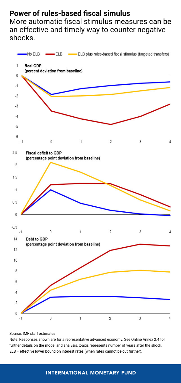 Notre étude montre que les mesures de relance budgétaire fondées sur des règles, telles que le déclenchement de transferts monétaires temporaires et ciblés en faveur des ménages à faible revenu en manque de liquidités lorsque le taux de chômage dépasse un certain seuil, pourraient contrer de manière très efficace une récession causée par une insuffisance classique de la demande. Malgré leur caractère automatique, ces mesures de relance seraient très différentes des stabilisateurs automatiques traditionnels, qui sont plutôt liés à la situation individuelle de chacun (par exemple, un licenciement pour l'assurance chômage ou une baisse du revenu pour l'impôt progressif sur le revenu). Les mesures de relance budgétaire fondées sur des règles sont particulièrement efficaces lorsque les taux d'intérêt se situent à leur plancher effectif (lorsque les taux ne peuvent être réduits davantage) et que les délais de mise en œuvre des mesures budgétaires discrétionnaires sont longs. En outre, la relance budgétaire après un choc sur la demande est en règle générale particulièrement efficace lorsque l'économie dispose de ressources inutilisées et que la politique monétaire est accommodante.