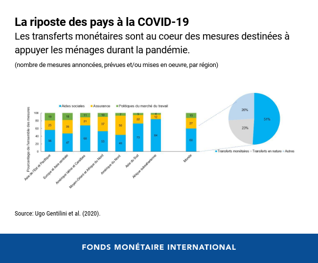 En Afrique subsaharienne, plus de 80 % mesures annoncées depuis le début de la pandémie ont pris la forme de transferts et seulement 4 % de politiques de marché du travail. À l’échelle mondiale, 30 % de toutes les initiatives prises par les pays relèvent de transferts monétaires.