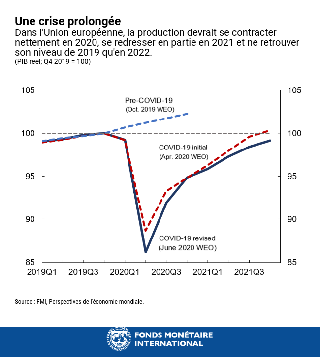 L’Europe, tout comme le reste du monde, est confrontée à une crise prolongée. Tant que la pandémie de COVID19 persistera, nous devrons, que nous le voulions ou non, maintenir une forme de distanciation sociale. À cela s’ajoutent des perturbations constantes des chaînes d’approvisionnement et d’autres problèmes qui prolongent une situation déjà difficile. D’après des projections actualisées du FMI publiées le mois dernier, le PIB réel dans l’UE devrait se contracter de 9,3 % en 2020, puis s’accroître de 5,7 % en 2021 et ne retrouver son niveau de 2019 qu’en 2022. La reprise pourrait s’accélérer si l’on découvrait un traitement efficace ou un vaccin contre la COVID-19, mais elle pourrait aussi ralentir en cas de nouvelles grandes vagues d’infection.