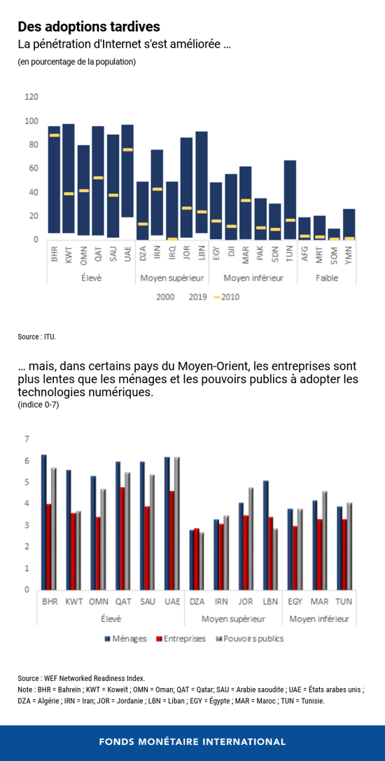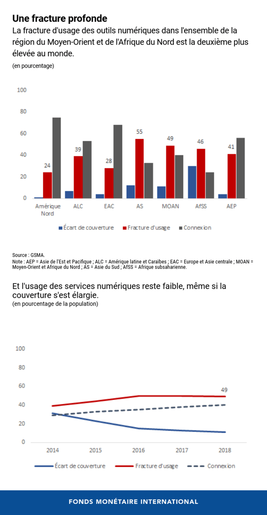 Des réformes de l’enseignement et du marché du travail s’imposent pour réduire le déficit de qualifications numériques. Les compétences numériques sont limitées dans toute la région Moyen-Orient et Afrique du Nord et certains pays qui possèdent un grand savoir-faire numérique, à l’instar du Liban et de l’Égypte, subissent parfois un exode des cerveaux vers des pays à revenu plus élevé, dont ceux du CCG. Rendre obligatoire les disciplines scientifiques, technologiques, techniques et mathématiques et dispenser un enseignement et une formation techniques et professionnels à travers des partenariats public-privé pourra accroître l’offre de compétences techniques à moyen terme. Parallèlement, un assouplissement des restrictions en matière d’emploi pour faciliter le recrutement d’expatriés dans des domaines très techniques pourra réduire le déficit de qualifications à court terme.