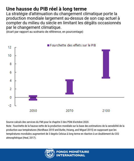 Premièrement, elles relanceront le PIB mondial et l'emploi au cours des premières années suivant la sortie de la crise de la COVID‑19. Deuxièmement, l'infrastructure verte améliorera la productivité dans les secteurs à faible émission de carbone, ce qui incitera le secteur privé à investir dans ces secteurs et facilitera la transition vers des prix du carbone plus élevés. De son analyse de scénario fondée sur des modèles, le FMI conclut qu'une stratégie globale d’atténuation des effets des changements climatiques pourrait faire augmenter le PIB mondial pendant les 15 premières années suivant la sortie de la crise d'environ 0,7 % en moyenne et stimulerait l'embauche pendant environ la moitié de cette période, donnant un emploi à environ 12 millions de personnes supplémentaires dans le monde. À mesure que la reprise s'installera, les prix du carbone annoncés à l'avance et en augmentation progressive contribueront dans une large mesure à la nécessaire réduction des émissions de carbone.