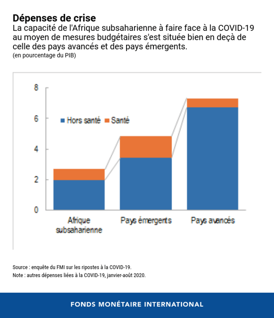 Cependant, les pays de la région ont abordé la crise avec un espace budgétaire bien moindre que celui dont ils disposaient avant la crise financière mondiale de 2008-09. Les mesures de soutien budgétaires liées à la COVID-19 ont atteint en moyenne 3 % du PIB en Afrique subsaharienne, soit bien moins que dans les autres régions du monde.