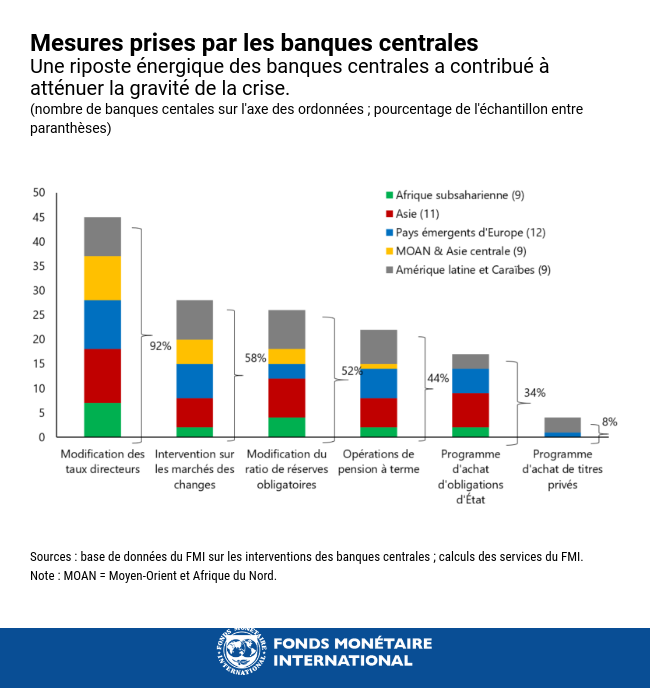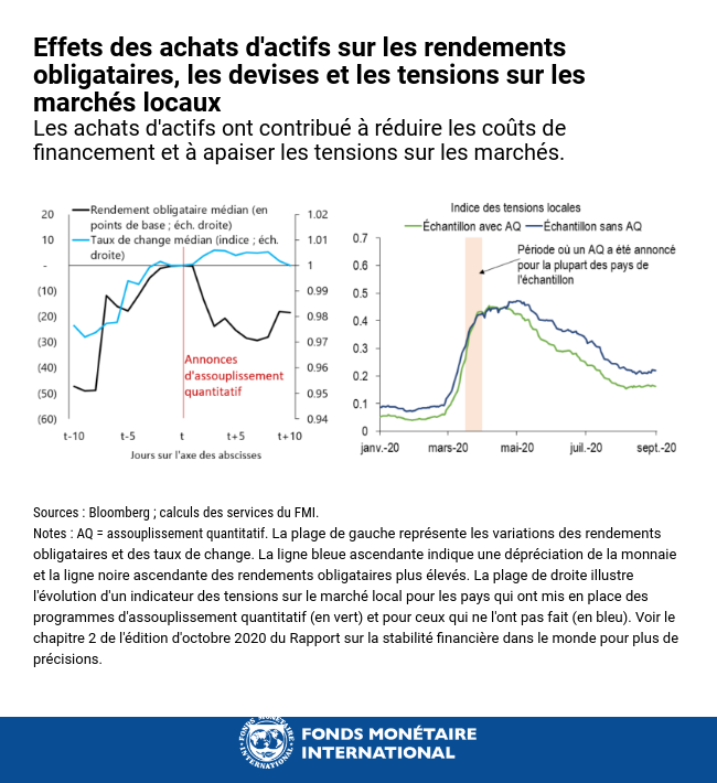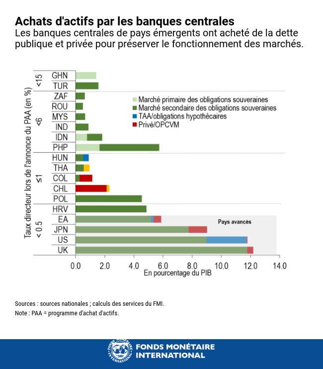Pratiquement toutes les banques centrales ont baissé leurs taux, la plupart d’entre elles est intervenue sur les marchés des changes et environ la moitié d’entre elles a réduit le ratio de réserves obligatoires des banques, ce qui a permis un apport de liquidités dans le système financier et a assoupli les conditions de crédit. En outre, les banques centrales de quelque 20 pays émergents ont pour la première fois lancé des programmes d’assouplissement quantitatif, officiellement appelés programmes d’achat d’actifs : elles ont acheté de la dette publique et privée afin d’apaiser les tensions et de préserver le fonctionnement des marchés. D’après notre récente analyse dans le Rapport sur la stabilité financière dans le monde, ces programmes d’achat d’actifs se sont en général révélés efficaces, notamment en contribuant à stabiliser les marchés financiers locaux.