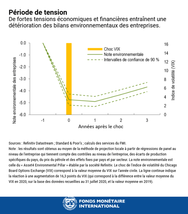 Un choc ayant de fortes répercussions macroéconomiques et financières, tel que celui de la crise liée à la pandémie de COVID-19, accroît l'incertitude et perturbe l'activité économique. En règle générale, il amplifie ainsi les difficultés financières des entreprises et risque de les dissuader de réaliser des investissements verts.