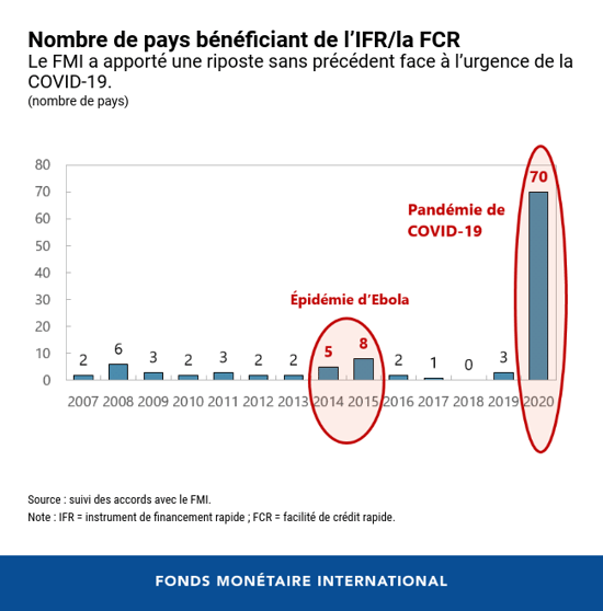 La pandémie de COVID-19 se traduit par un lourd bilan humain et des perturbations de l’économie mondiale qui ont entraîné une demande de financement sans précédent. Plus du tiers des pays membres du FMI ont bénéficié d’un appui de l’institution. Depuis l’apparition de la pandémie, le FMI a réagi de manière rapide et déterminée pour répondre à la demande urgente et exceptionnelle d’aide financière en faveur de ses pays membres.