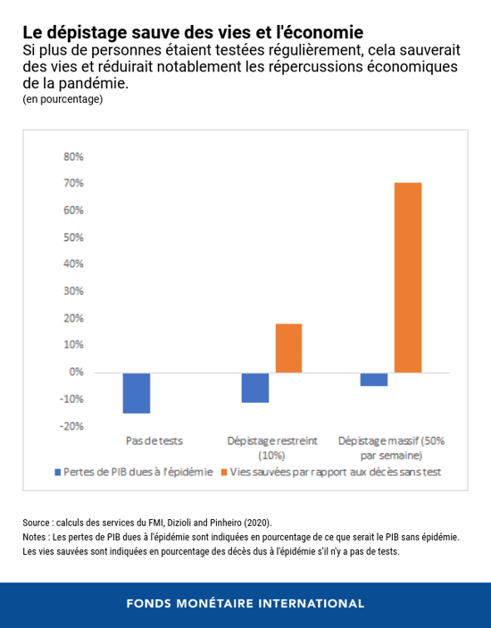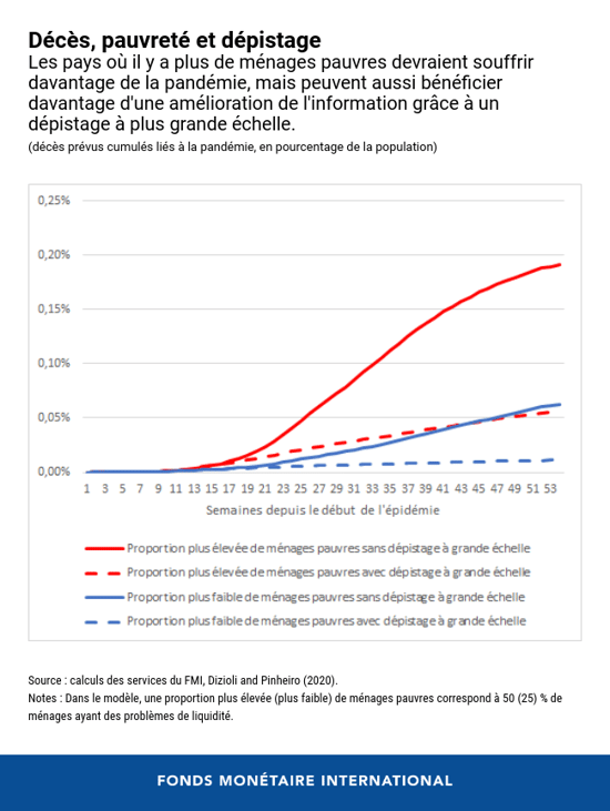 Dans une récente étude, le FMI précise le lien entre richesse et santé dans le contexte de la pandémie. L'analyse, qui repose sur un modèle, montre qu'un dépistage plus généralisé et plus rapide peut fournir des informations vitales permettant de mieux juguler la propagation du virus, ce qui profite à tous, mais surtout aux pauvres. L’étude transcende la plupart des modèles épidémiologiques en ce qu’elle se penche sur le comportement et les choix individuels en fonction des revenus, au lieu de ne tenir compte que de l'âge, du sexe et d'autres facteurs démographiques.