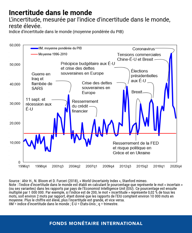 L’incertitude mondiale a atteint des niveaux inédits au début de la flambée de COVID-19 et reste élevée. L’indice mondial d’incertitude, qui mesure l’incertitude économique et politique mondiale de manière trimestrielle dans 143 pays, montre qu’en dépit d'une baisse d'environ 60 % par rapport au pic observé au cours du premier trimestre de 2020, c’est-à-dire au début de la pandémie de COVID-19, l’incertitude reste supérieure d’environ 50 % à sa moyenne historique enregistrée au cours de la période 1996-2010.