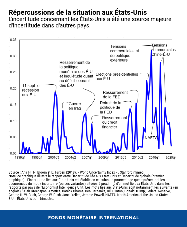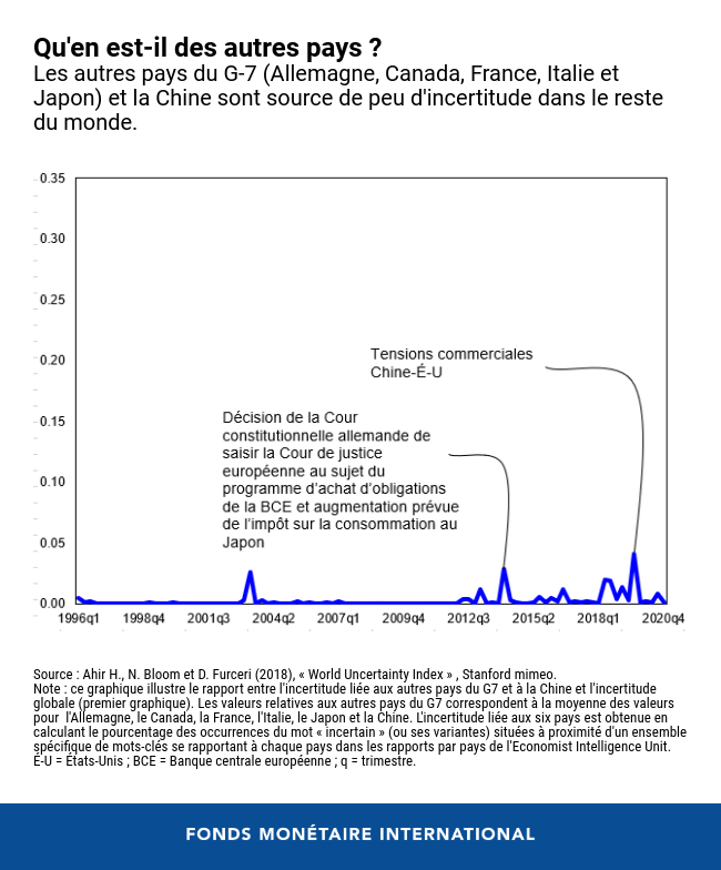 Par exemple, entre 2001 et 2003, elle a contribué de près de 8 % à l’incertitude dans les autres pays et de près de 23 % à la hausse de l’incertitude mondiale par rapport à la moyenne historique. Au cours des quatre dernières années, elle a contribué de près de 13 % à l’incertitude dans les autres pays, avec des pics de près de 30 %, et d'environ 20 % à la hausse de l’incertitude mondiale par rapport à la moyenne historique.