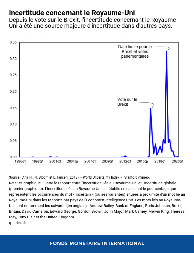 L’incertitude liée aux négociations sur le Brexit entre le Royaume-Uni et l’Union européenne s’est elle aussi propagée de manière non négligeable dans le monde au cours des quatre dernière années, contribuant à hauteur de près de 11 % à l’augmentation de l’incertitude mondiale durant cette période, atteignant même ponctuellement plus de 30 %.