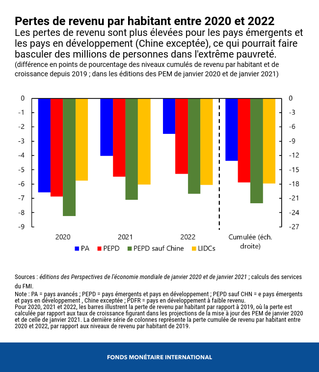 D’après nos estimations, à la fin de l’année 2022, le revenu par habitant cumulé sera inférieur de 13 % aux niveaux prévus avant la crise dans les pays avancés, de 18 % dans les pays à faible revenu, et de 22 % dans les pays émergents et les pays en développement, Chine exceptée. Ce décrochage attendu du revenu par habitant fera basculer dans l’extrême pauvreté des millions d'habitants de pays en développement.