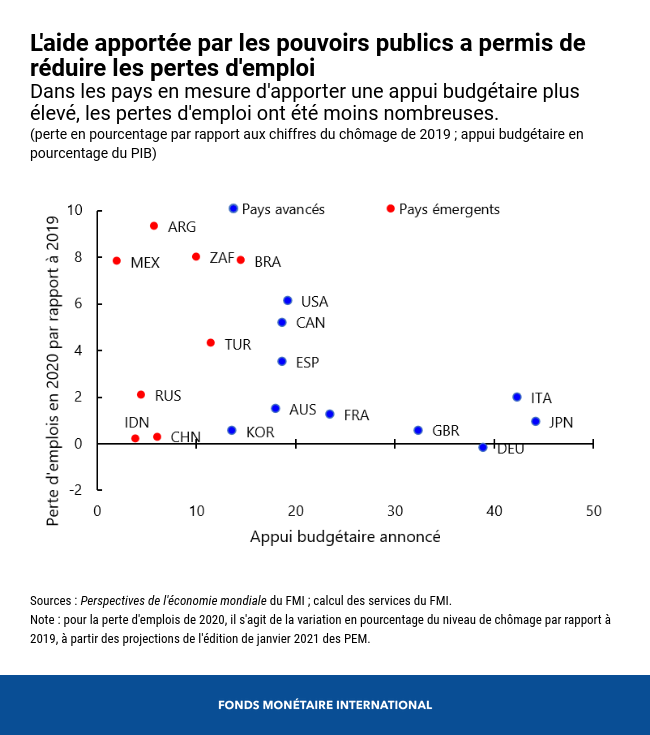 L’année dernière, les pays avancés ont dépensé en moyenne l’équivalent de 24 % de leur PIB en mesures budgétaires, contre seulement 6 % dans les pays émergents et moins de 2 % dans les pays à faible revenu. Des comparaisons internationales ont également montré que des mesures ambitieuses de soutien à l’économie pendant la crise étaient souvent associées à une dégradation moins prononcée des chiffres de l’emploi.
