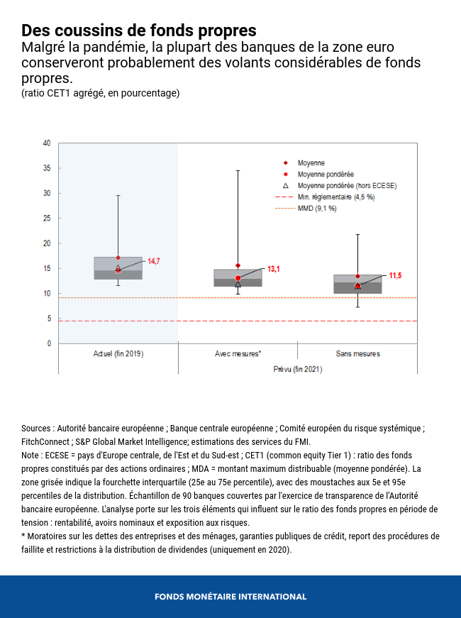 Sur la base des projections établies par le FMI en janvier 2021, les banques de la zone euro devraient sortir généralement indemnes de la profonde récession de 2020, à la faveur de la reprise entamée en 2021. Le ratio agrégé des fonds propres des banques devrait passer de 14,7 % à 13,1 %, à condition que les mesures de soutien à l’économie soient maintenues. Même en l’absence de telles mesures, il est acquis qu’aucune banque ne passera en deçà du seuil réglementaire de fonds propres de 4,5 %.