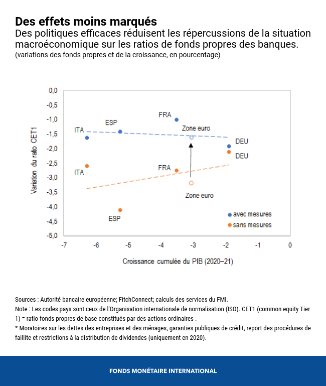 Les mesures de soutien jouent un rôle capital dans la réduction de l’ampleur et de la variabilité de l’érosion des fonds propres des banques. Elles atténuent sensiblement les effets du choc macroéconomique sur les fonds propres des banques, et réduisent les risques que celles-ci restreignent leur offre de crédit pour préserver leurs fonds propres. Outre l’assouplissement des exigences réglementaires en matière de fonds propres, ces mesures comportent un large éventail de dispositifs de soutien aux emprunteurs, comme des moratoires sur les dettes, des garanties de crédit et un report des procédures d’insolvabilité. Ces mesures peuvent également prendre la forme de subventions, d’allégements fiscaux et de subventions salariales aux entreprises.