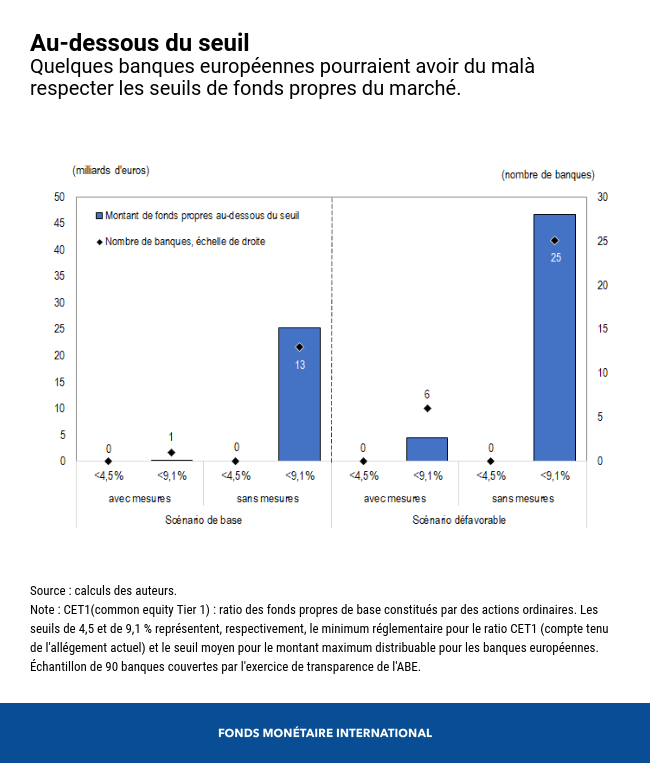 Une reprise poussive pourrait occasionner des pertes de crédit beaucoup plus lourdes, et des provisions plus importantes au titre des créances douteuses. Si la croissance du PIB en 2020-21 se retrouvait 1,2 point de pourcentage au-dessous du niveau prévu dans le scénario de référence, l’érosion des fonds propres des banques risquerait d’être plus marquée. Plus de 5 % de l’ensemble des banques risqueraient alors de ne plus respecter leurs seuils de montant maximal distribuable, malgré la mise en œuvre de mesures de soutien par les pouvoirs publics. Si ces mêmes mesures n’avaient pas les effets escomptés, plus de 10 % des banques seraient alors concernées.
