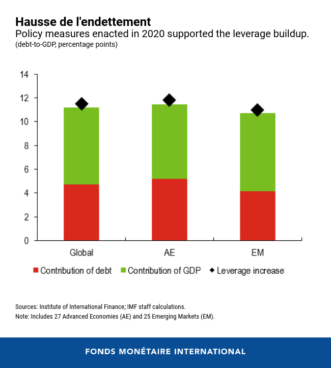 Dans les pays avancés comme dans les pays émergents, l’emprunt a encore augmenté sous l’effet des mesures de soutien prises par les pouvoirs publics face au choc de la COVID-19. En outre, la baisse de la production enregistrée dans de nombreux pays a contribué à la hausse du ratio dette/PIB, tandis que le ratio d’endettement des entreprises avait encore progressé de 11 % du PIB à la fin du 3e trimestre de 2020.
