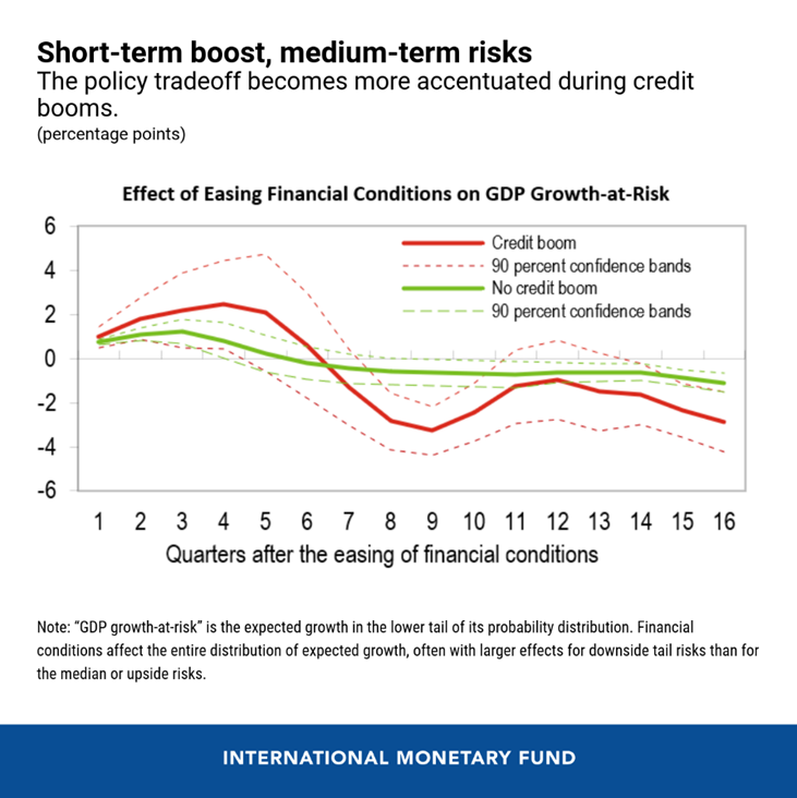 L’assouplissement des conditions financières — lorsque les investisseurs abaissent leur tarification du risque de crédit — stimule l’activité économique à court terme, mais il a un coût, car il s’accompagne d’un risque accru de ralentissement brutal à moyen terme, 7 à 8 trimestres plus tard. Cet arbitrage est encore plus net en période de boom du crédit, le stimulant à court terme étant plus prononcé, tandis que les risques de dégradation à moyen terme augmentent eux aussi.