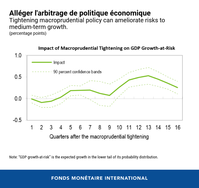 Notre analyse indique que les dirigeants peuvent prendre certaines mesures pour résoudre ce dilemme, ou tout au moins le réduire. Les politiques macroprudentielles — telles que l’introduction de limites d’accès au crédit pour les emprunteurs ou l’augmentation des ratios minimaux de fonds propres ou de liquidité pour les banques — peuvent juguler la hausse du ratio d’endettement du secteur non financier.