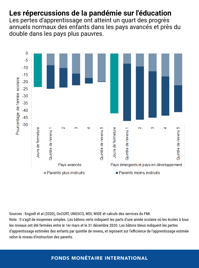 D’autre part, la COVID-19 accroît également les inégalités. L’éducation des enfants en est un exemple. Notre analyse montre qu’avec les fermetures massives d’écoles, les pertes d’apprentissage enregistrées en 2020 sont estimées à un quart de l’année scolaire et à deux fois plus dans les pays émergents et en développement. Les enfants issus de familles pauvres y contribuent de manière disproportionnée. Selon nos estimations, jusqu’à 6 millions d’enfants des pays émergents et des pays en développement pourraient abandonner leurs études en 2021, avec des conséquences négatives irrémédiables.
