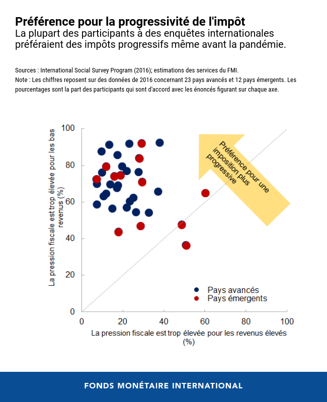 Les gouvernements souhaiteront sans doute envisager l’élaboration de trains de mesures globaux qui augurent d’un accès élargi aux services publics et d’une meilleure protection contre les chocs de revenus, tout en soutenant une reprise inclusive et génératrice d’emplois. Dans certains pays, le soutien public en faveur d’un meilleur accès aux services de base, financé au moyen d’une imposition supérieure, est solide et devrait s’accroître avec la pandémie. Selon une étude récente menée aux États-Unis, celles et ceux qui avaient personnellement subi les effets de la COVID-19, du fait de la maladie ou de la perte de leur emploi, ont exprimé une préférence marquée pour une imposition plus progressive.