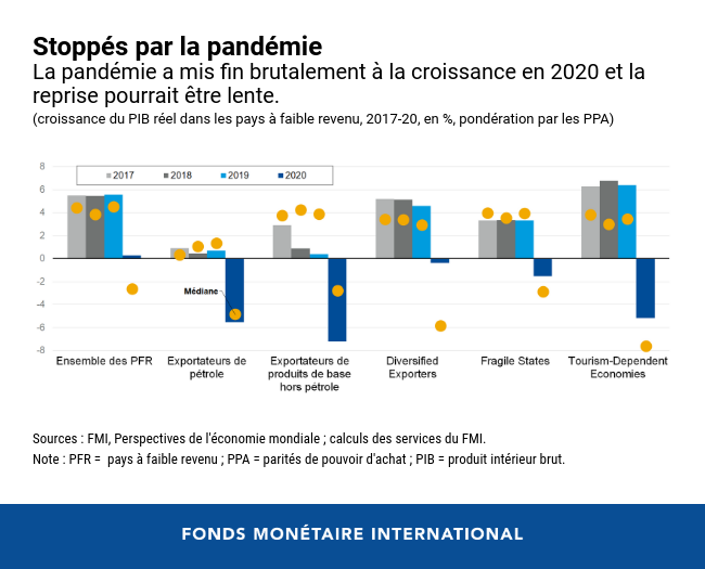 Plusieurs facteurs freinent la reprise économique des pays à faible revenu. Premièrement, l'accès aux vaccins y est inégal. La plupart de ces pays dépendent presque exclusivement du mécanisme multilatéral COVAX, initiative mondiale destinée à donner un accès équitable aux vaccins et dirigée par un consortium d'organisations internationales. Il est actuellement prévu que le COVAX fournisse 20 % seulement de la population des pays à faible revenu.