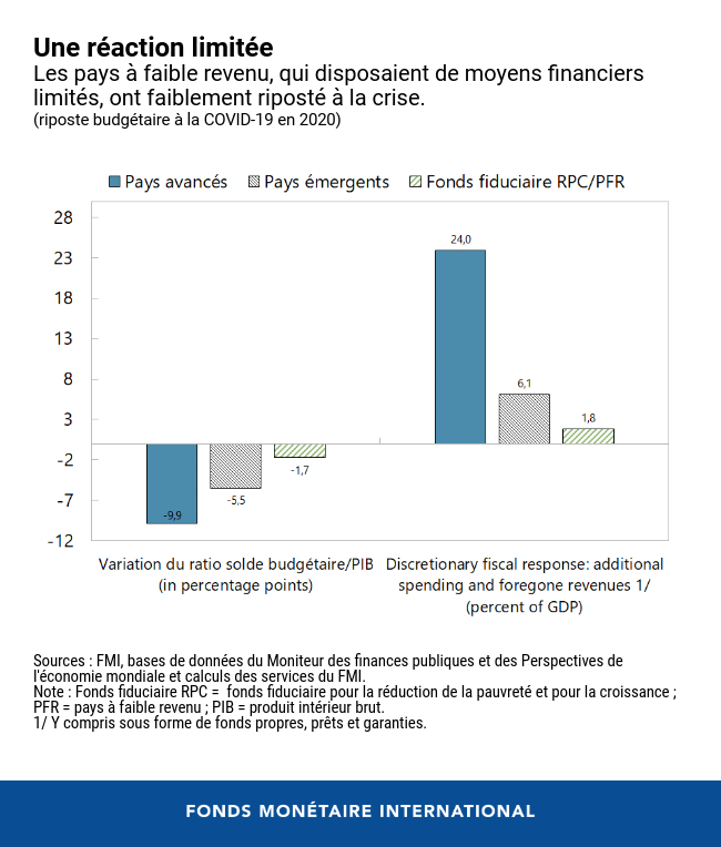 Deuxièmement, les pays à faible revenu disposent d'une marge de manœuvre limitée pour réagir à la crise. Plus précisément, ils n'ont pas eu les moyens d'engager des dépenses supplémentaires (voir le graphique).