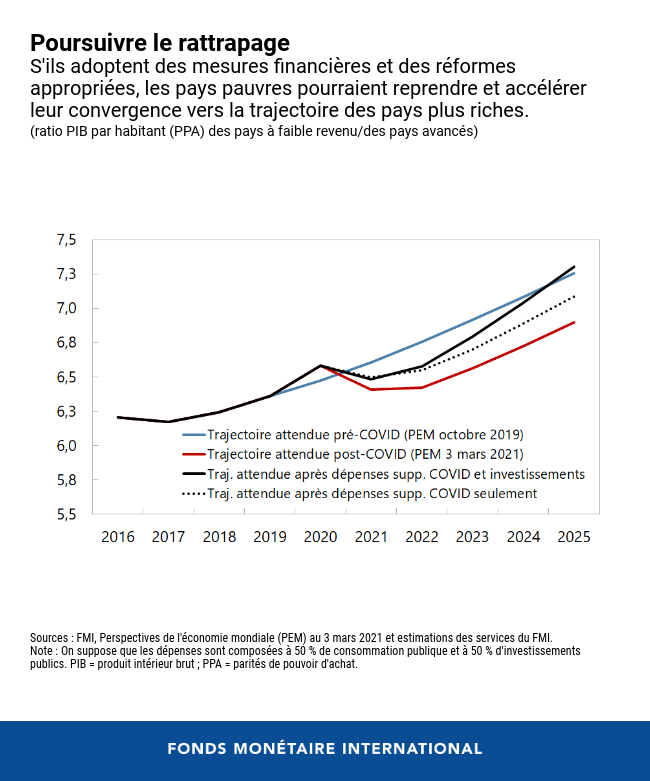 Compte tenu de l'endettement de nombreux pays à faible revenu, seule une partie de ces dépenses pourrait être financée par emprunt. Or s'ils disposaient de ces financements supplémentaires, les pays à faible revenu pourraient retrouver d'ici à 2025 la trajectoire de convergence avec les pays avancés sur laquelle ils étaient engagés avant la COVID.