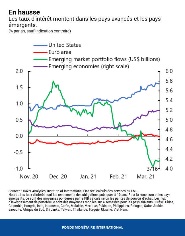 Aux États-Unis, la campagne de vaccination rapide et l’adoption d’un plan de relance budgétaire de 1 900 milliards de dollars ont stimulé la reprise économique attendue. En prévision, les taux d’intérêt américains à long terme ont augmenté rapidement, avec un rendement des titres du Trésor à 10 ans passant de moins de 1 % au début de l’année à plus de 1,75 % à la mi-mars. Une hausse de cet ordre s’est produite au Royaume-Uni. En janvier et en février, les taux d’intérêt ont aussi légèrement progressé dans la zone euro et au Japon, avant que les banques centrales n’y assouplissent la politique monétaire.