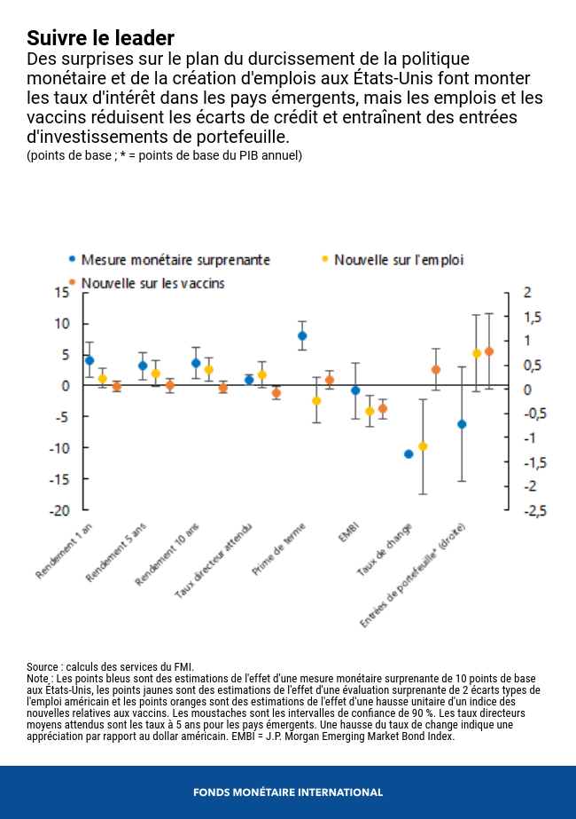 Lorsque les bonnes nouvelles sur l’emploi ou les vaccins contre la COVID-19 aux États-Unis en sont la raison, la plupart des pays émergents enregistrent des entrées d’investissements de portefeuille plus importantes et de moindres écarts de taux sur la dette libellée en dollars. Les bonnes nouvelles économiques des pays avancés pourraient se traduire par une croissance des exportations des pays émergents, et la reprise de l’activité économique a naturellement tendance à relever leurs taux d’intérêt intérieurs. D’une manière générale, les effets sur un pays émergent moyen sont plutôt favorables. Toutefois, les pays qui exportent moins vers les États-Unis tout en dépendant davantage de l’emprunt extérieur pourraient ressentir les tensions du marché financier.