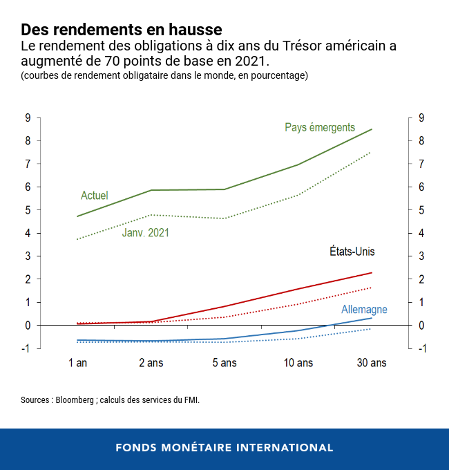 Dans son scénario de référence, le FMI estime que les conditions financières vont demeurer souples, même si les taux américains devaient continuer à grimper. Toutefois, un durcissement des conditions financières mondiales demeure un risque. Étant donné l’asynchronie et la vitesse variable de la reprise dans le monde entier, des hausses rapides et soudaines des taux américains pourraient avoir des répercussions importantes à l’échelle de la planète, en durcissant les conditions financières pour les pays émergents et en faisant obstacle à leur processus de reprise.