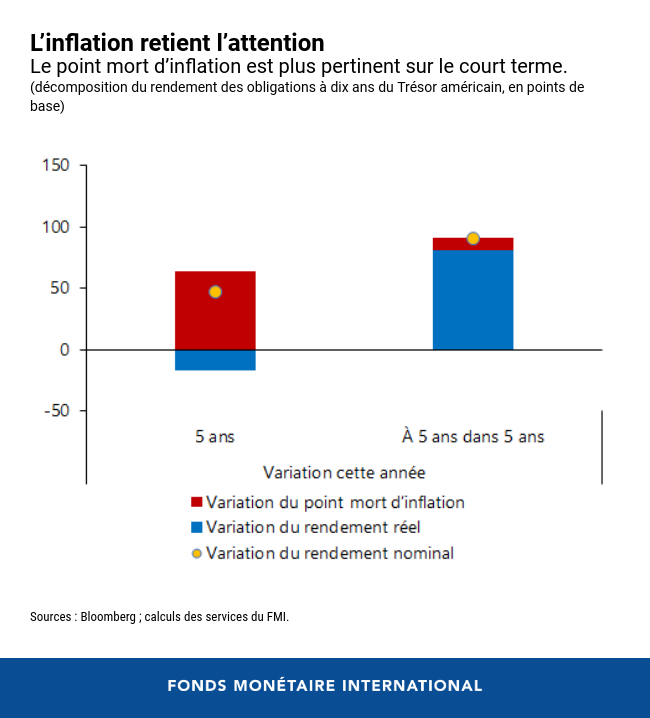 En revanche, la hausse du taux anticipé à cinq ans dans cinq ans tient essentiellement à une forte augmentation des rendements réels, laissant présager d’une amélioration des perspectives de croissance assortie d’un point d’inflation à plus long terme bien ancré.