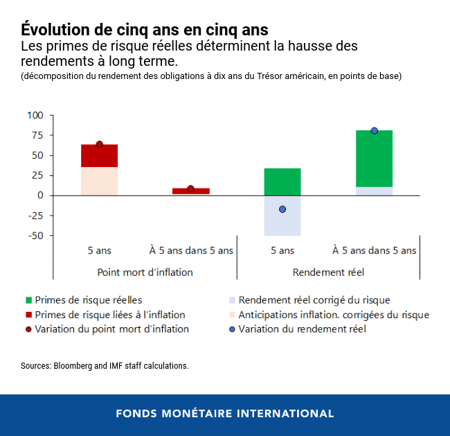 Il importe de noter que les points morts d’inflation et les rendements réels ne représentent pas seulement les attentes actuelles du marché en matière d’inflation et de croissance. Ils incluent aussi la rémunération dont les investisseurs ont besoin pour supporter les risques associés à ces deux éléments. La prime de risque d’inflation est liée aux incertitudes entourant l’inflation future. Et le rendement réel comprend une prime de risque réelle, qui traduit les incertitudes sur la trajectoire future des taux d’intérêt et les perspectives économiques. La somme des deux, que l’on appelle communément la prime à terme, représente la rémunération dont les investisseurs ont besoin pour supporter le risque de taux d’intérêt inhérent aux titres du Trésor.