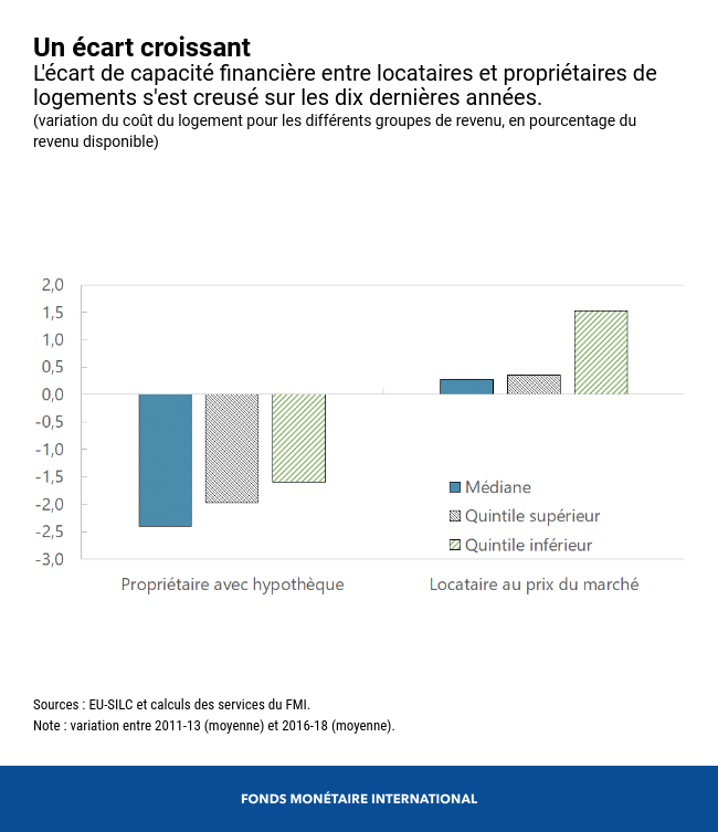 À l’inverse, les coûts de logement des propriétaires ont baissé depuis 2014. Ainsi, un locataire doit généralement débourser plus d’une fois et demie ce qu’un propriétaire dépense pour se loger, en proportion du revenu disponible. Cet écart s’est creusé d’environ 4 points de pourcentage entre 2011-13 et 2016-18 et cette évolution est particulièrement marquée chez les plus pauvres (les ménages appartenant au quintile inférieur de la répartition des revenus), comme le montrent les barres vertes de l’histogramme. La majorité des propriétaires ont donc directement profité de la faiblesse des taux d’intérêt durant cette période, contrairement aux locataires.