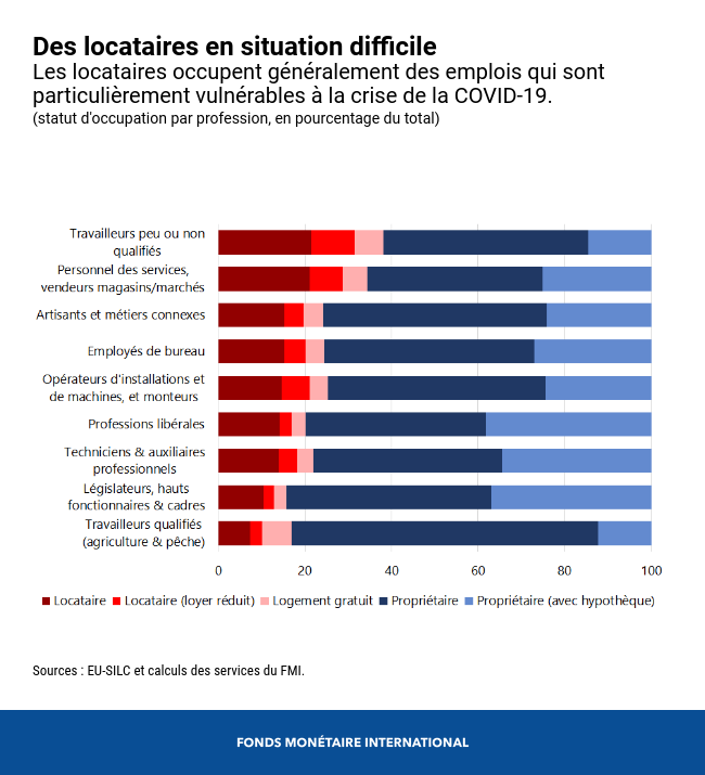 De nombreux locataires sont dans une situation particulièrement fragile face à la crise de la COVID-19, car ils travaillent plus souvent dans des secteurs où les contacts sont très fréquents, ils se trouvent en début de carrière et sont donc en situation de précarité professionnelle et ils ont généralement moins la possibilité de télétravailler. Ils ne pourront sans doute pas retrouver les niveaux de revenus antérieurs à la crise avant plusieurs années, et le retour à la normale sera sans doute encore plus long pour ceux qui doivent s’orienter vers de nouveaux secteurs. Une diminution des coûts du logement locatif compenserait en partie ces pertes de revenus, mais la baisse des loyers observée jusqu’à présent concerne majoritairement les grandes destinations touristiques et les biens haut de gamme. En outre, l’ampleur et la durée des changements de comportement qui pourraient réduire les coûts du logement locatif sont entourées de fortes incertitudes. Par conséquent, les phénomènes de divergence économique et d’accroissement des inégalités, présents avant la pandémie, devraient s’accentuer.