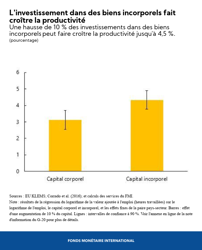 En comparaison, une augmentation du capital matériel (comme les bâtiments et les machines) s’accompagne d’une hausse légèrement plus faible de la productivité. Avec le recul de la COVID-19, les entreprises qui ont investi dans des actifs incorporels, tels que les technologies numériques et les brevets, pourraient donc enregistrer une plus forte productivité.