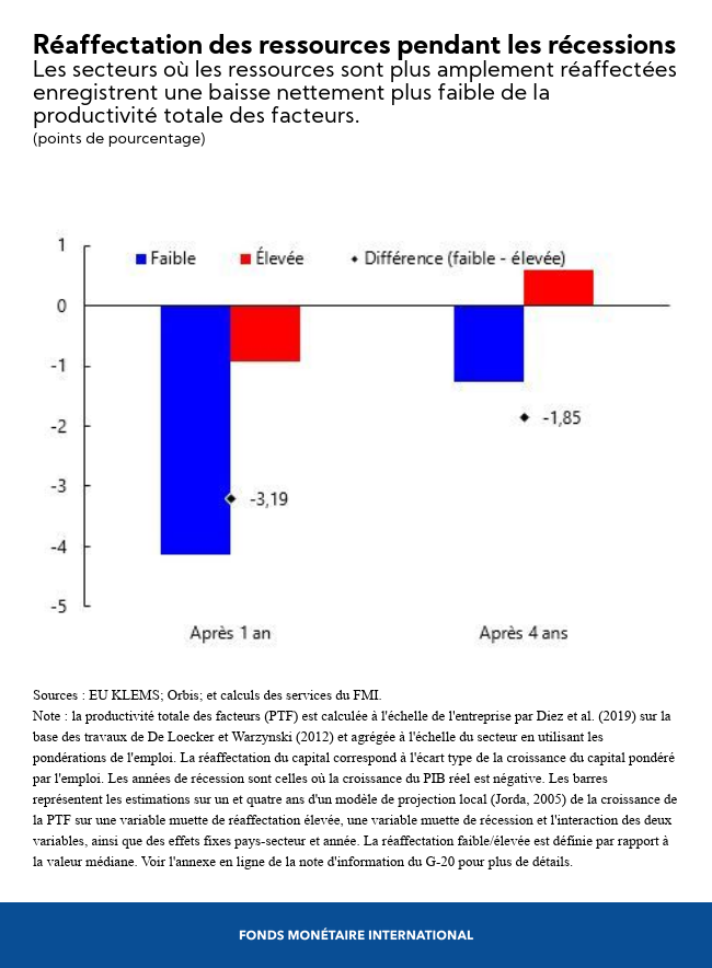Premièrement, les flux de main-d’œuvre et de capital vers des entreprises plus productives ont tendance à relever la productivité et peuvent contribuer à amortir le choc d’une récession (par exemple, si des travailleurs licenciés sont réembauchés par des entreprises plus productives). Comme l’indique le graphique ci-dessous, selon une analyse fondée sur des données recueillies auprès d’entreprises de 19 pays sur une période de 20 ans, les secteurs où les ressources sont plus amplement réaffectées enregistrent en général une baisse nettement plus faible de la productivité totale des facteurs pendant les récessions et se rétablissent plus rapidement par la suite.