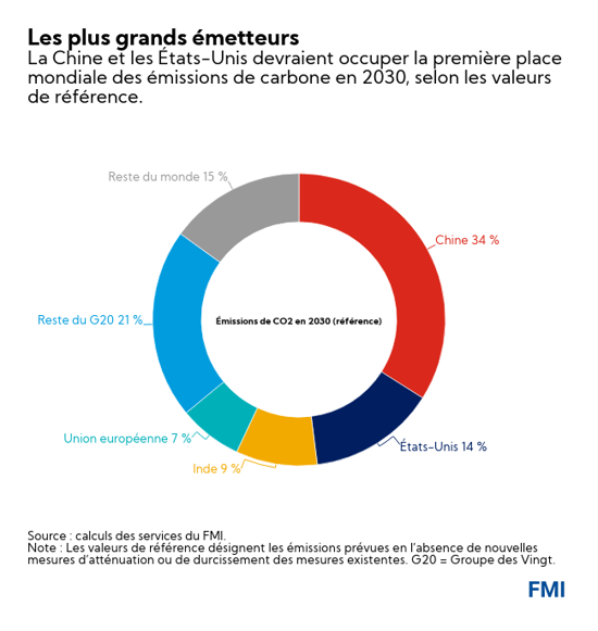 - lancé par les plus grands pays émetteurs. Le graphique montre que la Chine, l’Inde, les États-Unis et l’Union européenne seront responsables de près des deux tiers des émissions mondiales de CO2 prévues en 2030 (si aucune nouvelle mesure d’atténuation n’est prise). Si l’ensemble des membres du G20 sont pris en compte, ce chiffre atteint 85 %. Une fois lancé, le système pourrait être progressivement étendu à d’autres pays ;
