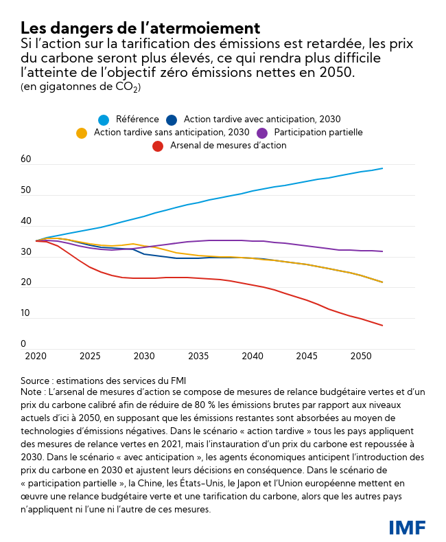 Notre analyse montre qu’en retardant de dix ans la tarification du carbone, l’objectif zéro émissions nettes au mitan du vingt-et-unième siècle serait nettement hors de portée, car les tarifs nécessaires à ce moment-là pour atteindre l’objectif paraîtraient intenables. Un tel retard par rapport à l’instauration rapide de la tarification du carbone se traduirait par une hausse des températures, avec des dommages irréversibles sur le climat et sur l’économie. Un accord pour des prix plancher du carbone chez les principaux émetteurs, comme l’ont récemment proposé les services du FMI, à différents niveaux suivant le stade de développement, pourrait faciliter les progrès sur le front de la tarification en apaisant les craintes de voir les entreprises des secteurs énergivores et exposés au commerce international subir des pertes de compétitivité et des délocalisations au profit de pays où les prix sont bas, si les mesures étaient prises unilatéralement.