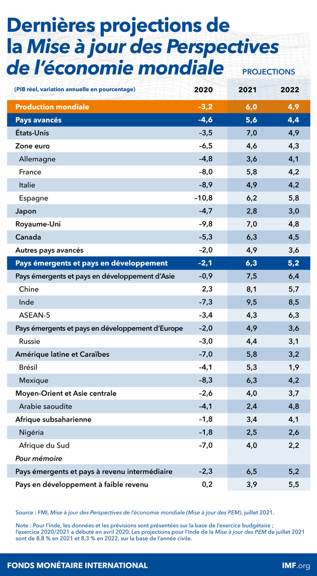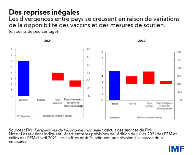 Pour les pays avancés, les projections de croissance se sont améliorées de 0,5 point de pourcentage cette année. Toutefois, elles s’accompagnent de révisions à la baisse qui s’annulent mutuellement de façon équivalente pour les pays émergents et les pays en développement, en raison d’une dégradation considérable des prévisions pour les pays émergents d’Asie. Pour 2022, nous prévoyons une croissance globale de 4,9 %, en hausse par rapport à nos dernières prévisions de 4,4 %. Cela dit, ces prévisions supposent une amélioration considérable des perspectives pour les pays avancés, ainsi qu’une amélioration plus modeste pour les pays émergents et les pays en développement.