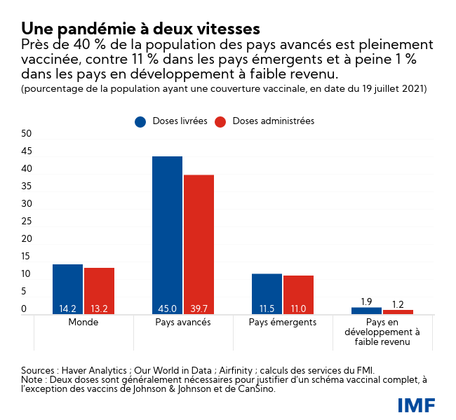 Dans une large mesure, ces révisions signalent des différences dans l’évolution de la pandémie à mesure que se propage le variant delta. Près de 40 % de la population des pays avancés est pleinement vaccinée, contre 11 % dans les pays émergents et un tout petit pourcentage dans les pays en développement à faible revenu. Des taux de vaccination et un retour à la normale plus rapides que prévu ont mené à une amélioration des prévisions tandis que, faute d’accès aux vaccins et en raison d’une recrudescence de vagues d’infections à la COVID-19, notamment en Inde, certains pays ont connu une détérioration de leurs prévisions.