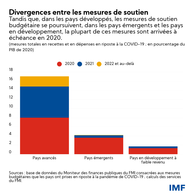 Les divergences entre les mesures de soutien constituent un deuxième facteur de creusement des fractures. Les pays développés continuent de bénéficier d’un soutien budgétaire considérable ; en effet, les aides annoncées en riposte à la pandémie, de l’ordre de 4 600 milliards de dollars, seront déployées en 2021 et au-delà. La révision à la hausse de la croissance mondiale pour 2022 reflète dans une large mesure les attentes relatives aux mesures de soutien budgétaire mises en place aux États-Unis, ainsi qu’aux fonds prévus dans le cadre du plan de relance pour l’Europe (Next Generation EU).