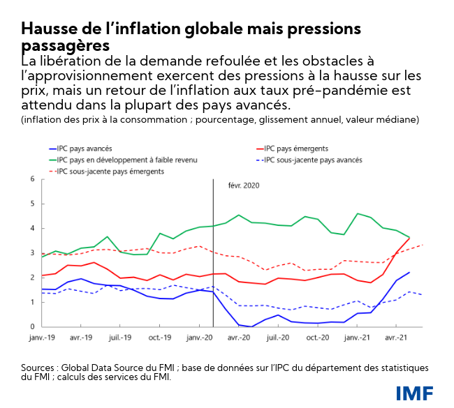Les contrecoups provoqués par les bouleversements de l’an dernier posent des difficultés singulières en matière d’action publique. La libération de la demande refoulée et les goulets d’étranglement dans l’approvisionnement exercent des pressions à la hausse sur les prix. Néanmoins, dans la plupart des pays avancés, l’inflation devrait redescendre à ses taux d’avant la pandémie en 2022 pour les raisons suivantes :