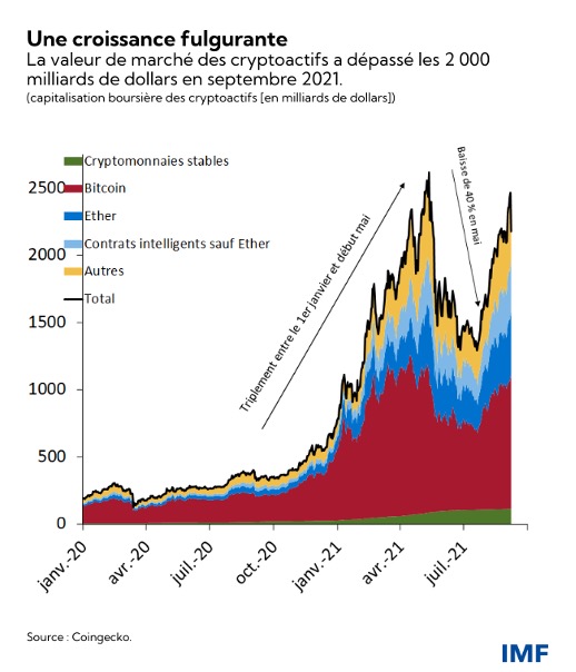 La valeur de marché du total des cryptoactifs en circulation a dépassé les 2 000 milliards de dollars en septembre 2021, soit 10 fois plus que début 2020. En parallèle, tout un écosystème se met en place, avec des bourses, des portefeuilles électroniques, des « mineurs » et des émetteurs de cryptomonnaies stables.