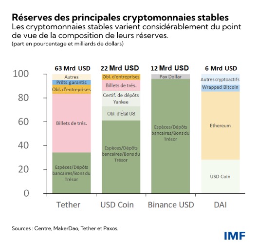Les cryptomonnaies stables, qui cherchent généralement à s’arrimer au dollar, connaissent également une croissance foudroyante : leur volume a été multiplié par quatre en 2021 et atteint désormais 120 milliards de dollars. Cependant, le terme «cryptomonnaie stable» recouvre un ensemble très varié de cryptoactifs, et peut s’avérer trompeur. Étant donné la composition de leurs réserves, certaines cryptomonnaies stables pourraient donner lieu à des épisodes de panique des investisseurs, avec un risque de contagion au système financier. Ces épisodes de panique pourraient survenir en raison d’inquiétudes des investisseurs quant à la qualité de leurs réserves ou concernant la possibilité de rapidement liquider ces réserves pour s’acquitter d’éventuels remboursements.