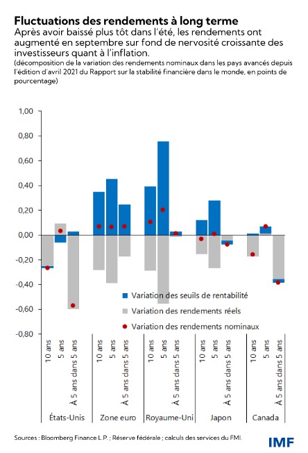 La dégradation de l’humeur du marché depuis l’édition d’avril 2021 du Rapport sur la stabilité financière dans le monde a engendré une forte diminution à l’échelle mondiale des rendements nominaux à long terme durant l’été. Cette dernière s’explique également par la chute des taux réels, due aux inquiétudes relatives aux perspectives de croissance à long terme. Cependant, fin septembre, la nervosité des investisseurs quant aux pressions inflationnistes a fait grimper les rendements encore plus hauts sur fond de revirement des anticipations sur les tensions sur les prix désormais jugées plus pérennes que prévu dans certains pays — ce qui a intégralement effacé les baisses antérieures.