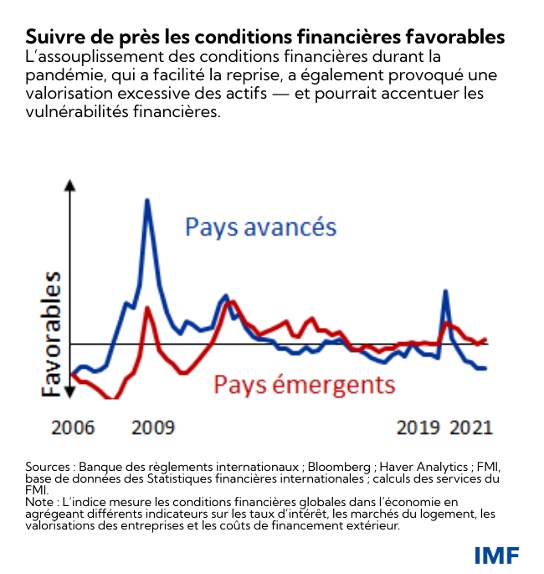 Le soutien massif à l’économie apporté par les politiques budgétaires et monétaires en 2020 et en 2021 a permis de limiter la contraction qui s’était amorcée au début de la pandémie et, pendant l’essentiel de 2021, d’étayer le puissant rebond de l’activité. Dans de nombreux pays avancés, les conditions financières ont été assouplies dès les premiers mois de la pandémie. Or, le vent d’optimisme qui avait poussé les marchés au premier semestre 2021 pourrait bien tomber.