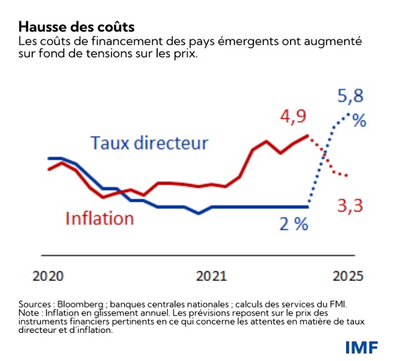 Dans les pays émergents et préémergents, les dirigeants devraient, autant que possible, commencer à reconstituer des marges de manœuvre budgétaires et mener des réformes structurelles. Confrontés à plusieurs défis sur le plan intérieur (hausse de l’inflation et préoccupations budgétaires), certains de ces pays sont également à la merci d’un brusque durcissement des conditions financières extérieures.